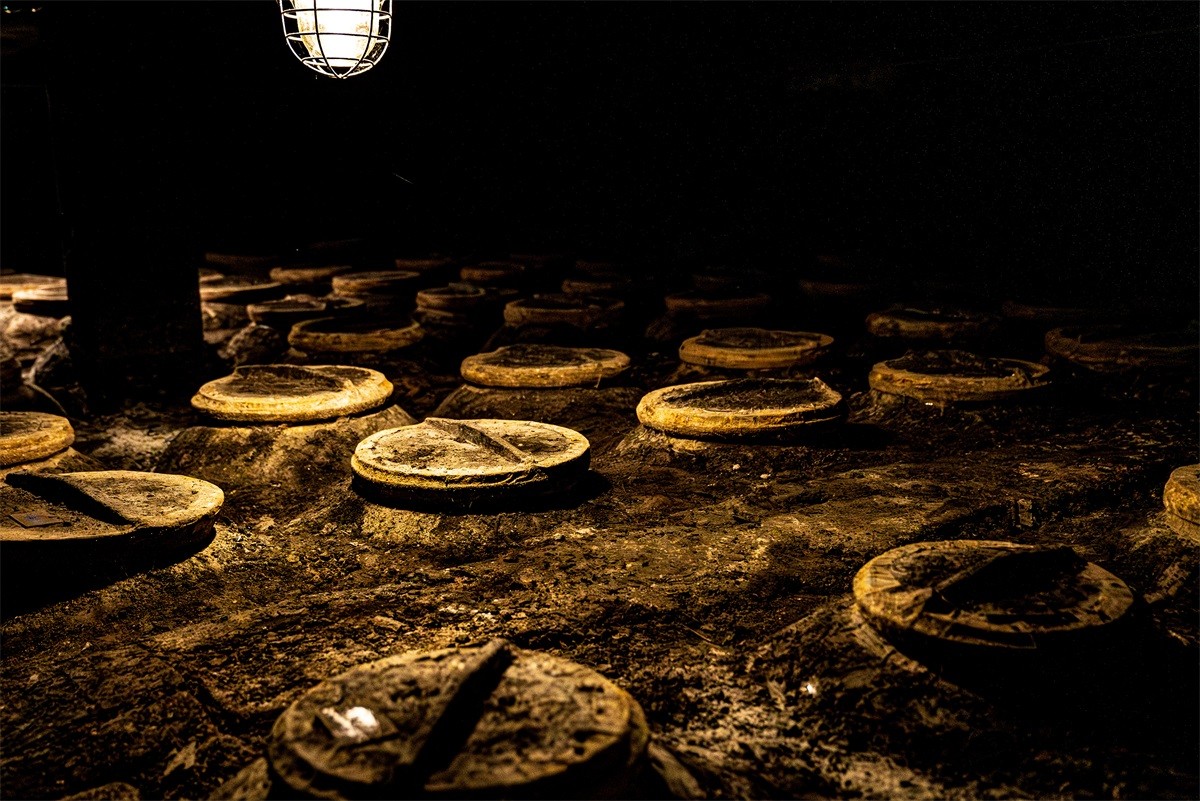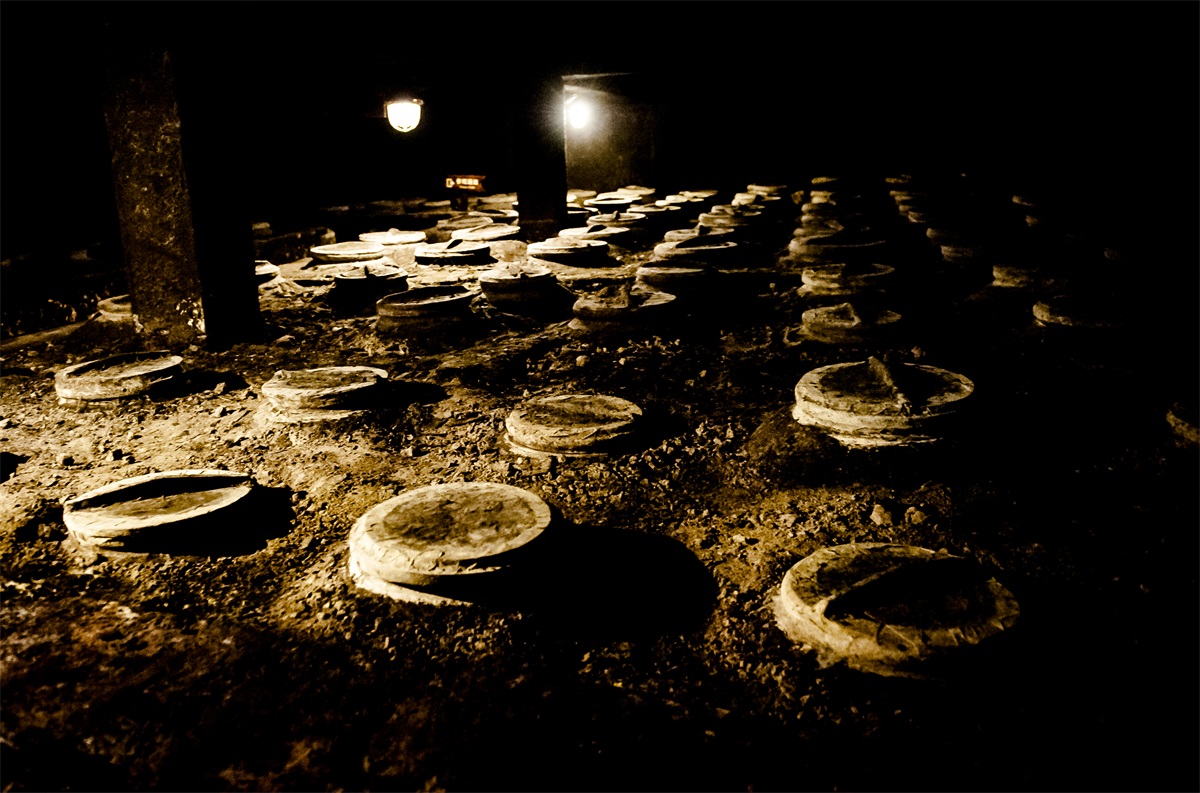 地下酒窖内共有陶坛3800余只,储酒陶坛坛龄在百年以上,被誉为“中国白酒的地下宫殿”。储存的原酒在独特的培土窖藏环境中,历经岁月沉淀,酒体自然老熟,成为滴滴珍贵的稀世陈酿,被称为“液体黄金”。