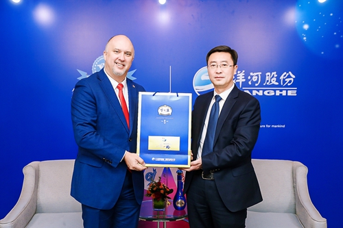 洋河股份党委书记、董事长,双沟酒业董事长张联东(右)向古巴驻华大使