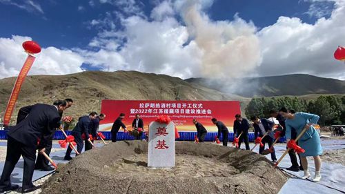 在本次开工仪式活动现场,自治区党委常委、拉萨市委书记普布顿珠和江苏省人大副主任马秋林为江苏援藏项目标识揭牌,自治区党委常委、拉萨市委书记普布顿珠宣布开工,最后各位领导扬起“第一锹”,共同为基石培土,标志着朗热酒村的建设正式拉开了帷幕。